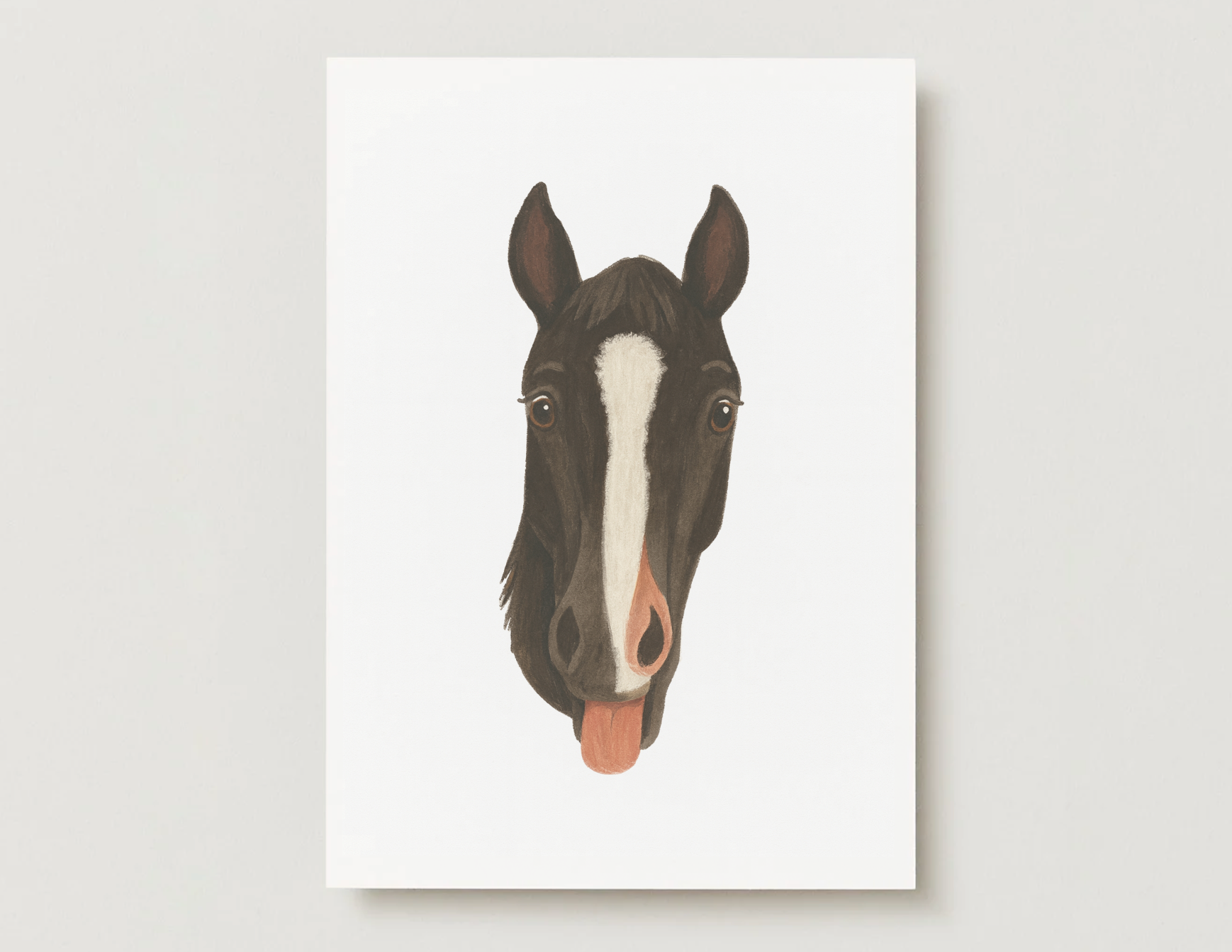 Diese liebevolle Karte zeigt unser echtes Horse & Harmonie Pferd Scrabble - Frech und Neugiergig. Sein herausgestreckter Kopf sorgt garantiert für ein Schmunzeln bei jedem, der sie erhält.